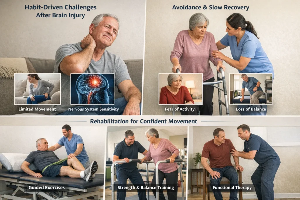 After a brain injury, many people experience changes in balance, strength, posture, and coordination. These challenges are not always caused by ongoing tissue damage. In many cases, they develop because the body learns to move more cautiously over time.